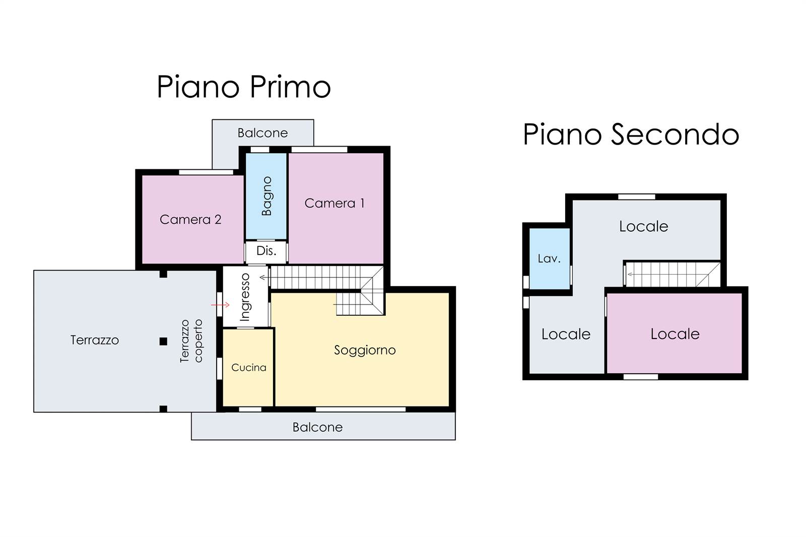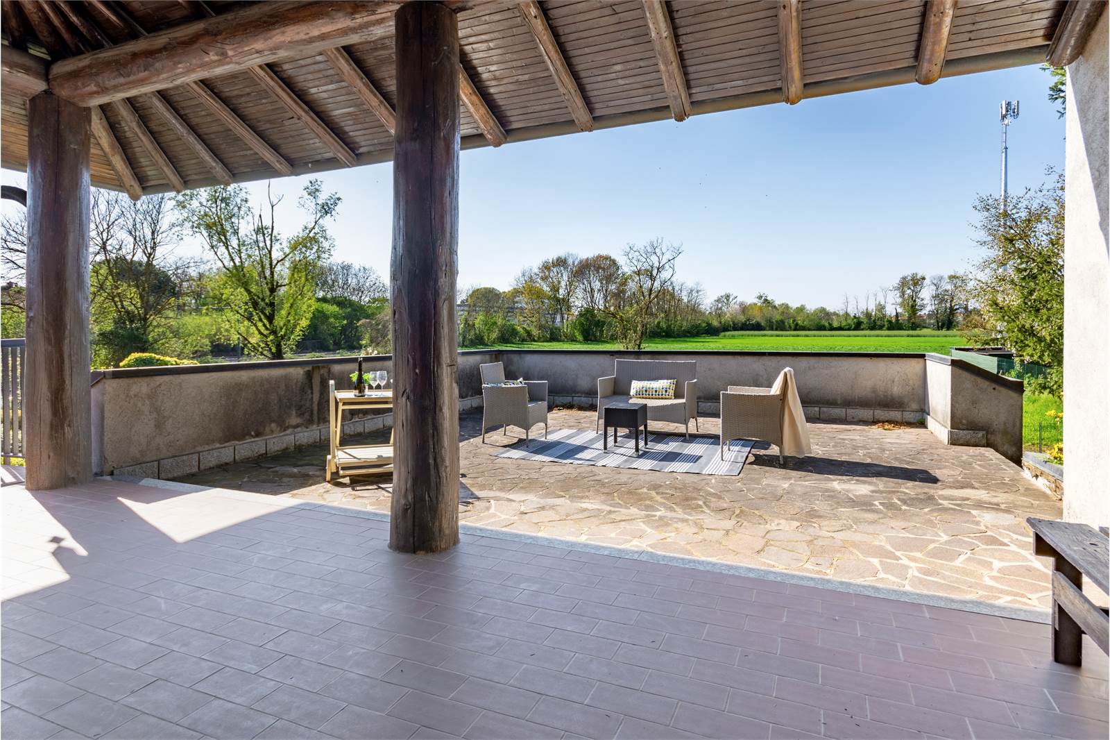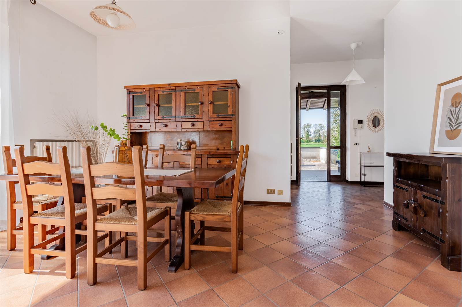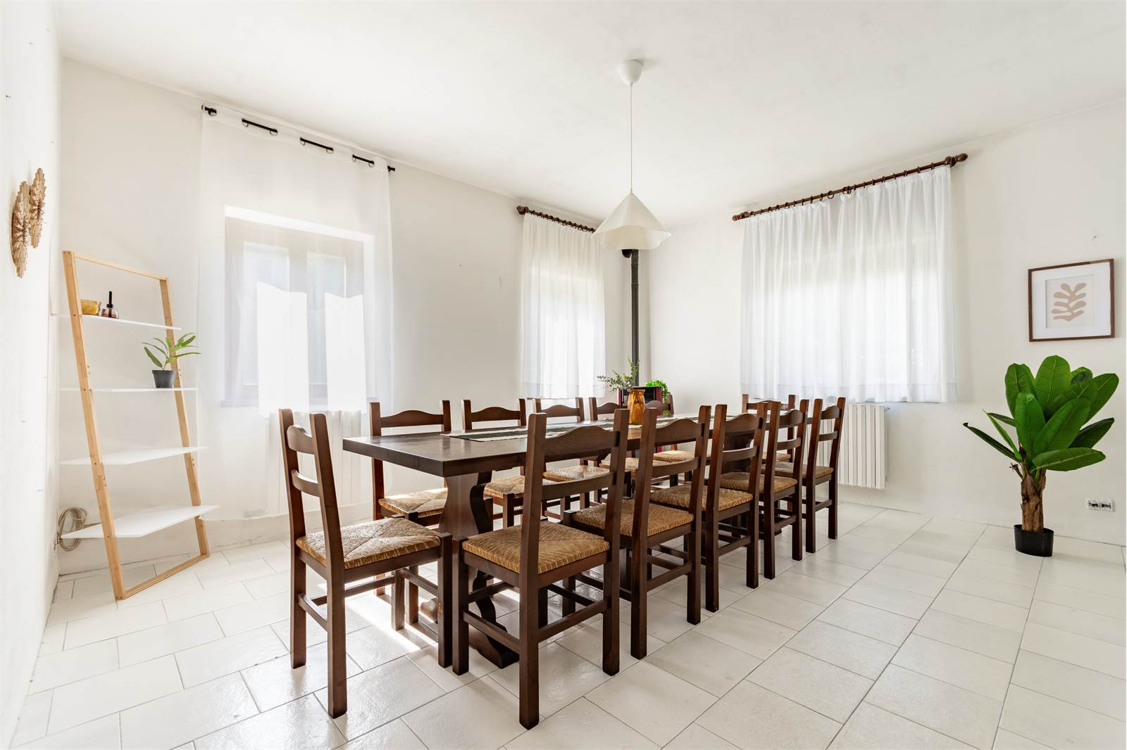 L'abitazione principale ha accesso da un grande terrazzo con vista sui campi e dal portico, che ci conduce alla zona giorno, composta da cucina e da un grande soggiorno con camino, illuminato da una importante portafinestra di 4 metri che esce sulla balconata, sul piano troviamo anche due camere da letto matrimoniali e grande bagno con vasca. Dal soggiorno, tramite la scala accediamo al piano superiore con ulteriori locali mansardati ampiamente sfruttabili.