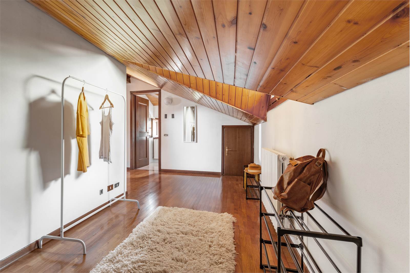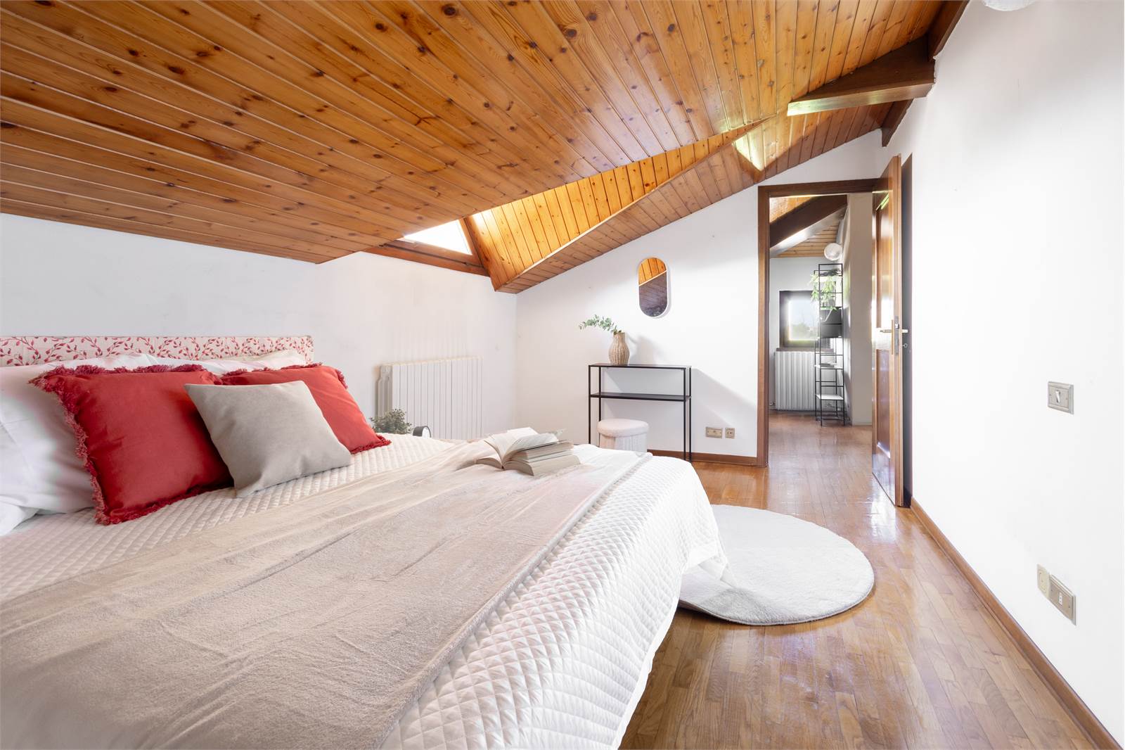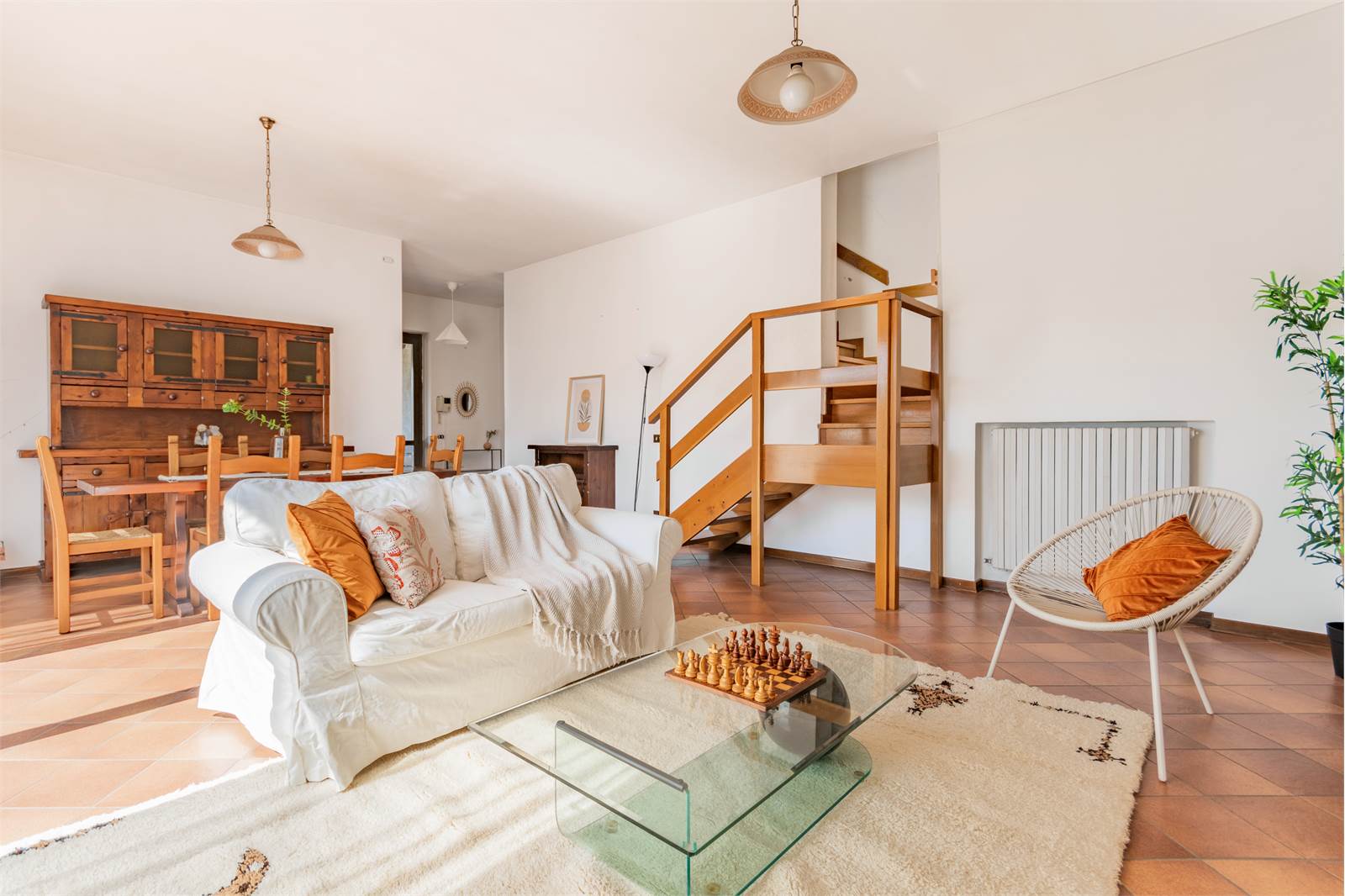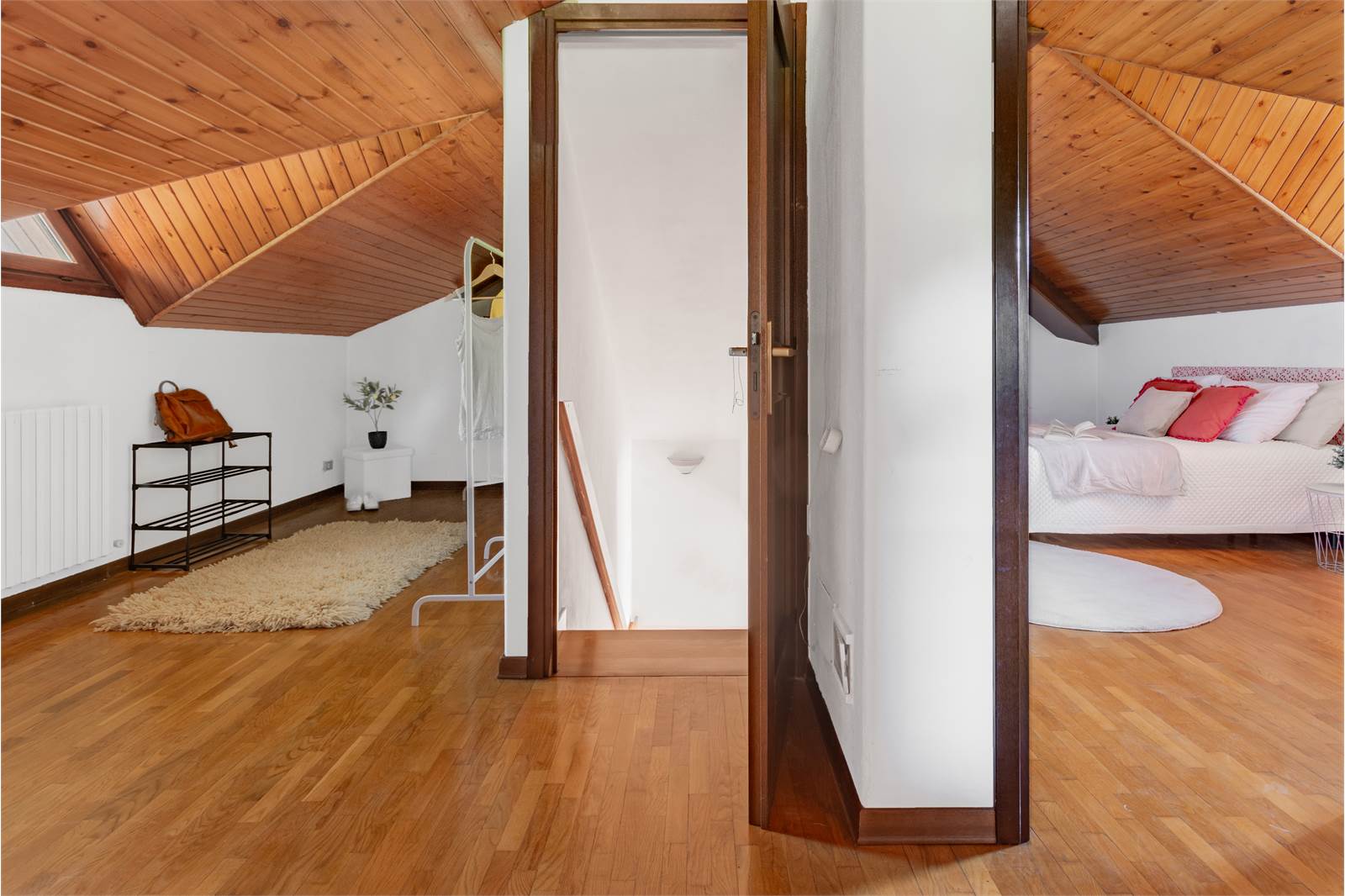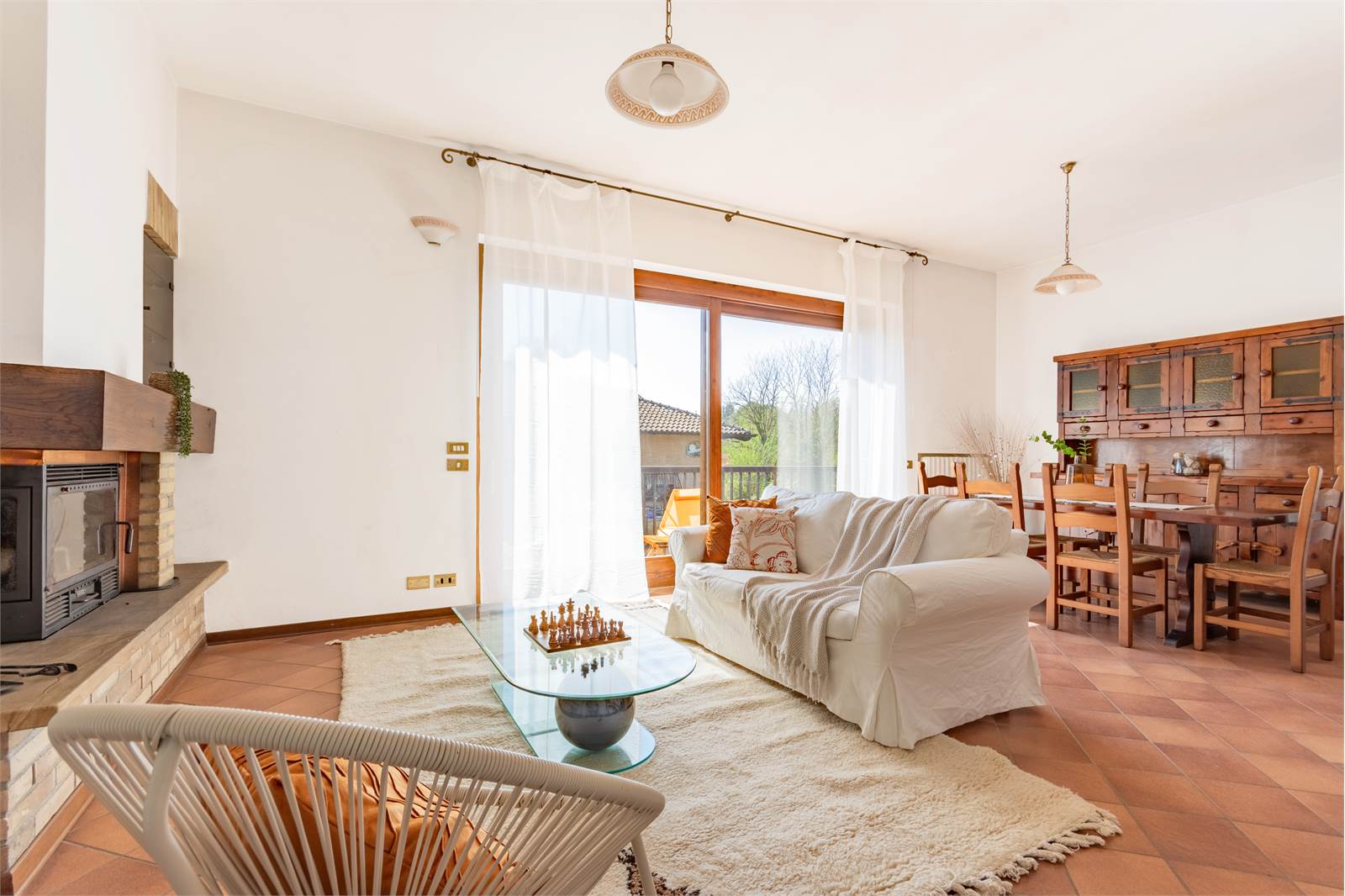 L'abitazione principale ha accesso da un grande terrazzo con vista sui campi e dal portico, che ci conduce alla zona giorno, composta da cucina e da un grande soggiorno con camino, illuminato da una importante portafinestra di 4 metri che esce sulla balconata, sul piano troviamo anche due camere da letto matrimoniali e grande bagno con vasca. Dal soggiorno, tramite la scala accediamo al piano superiore con ulteriori locali mansardati ampiamente sfruttabili.