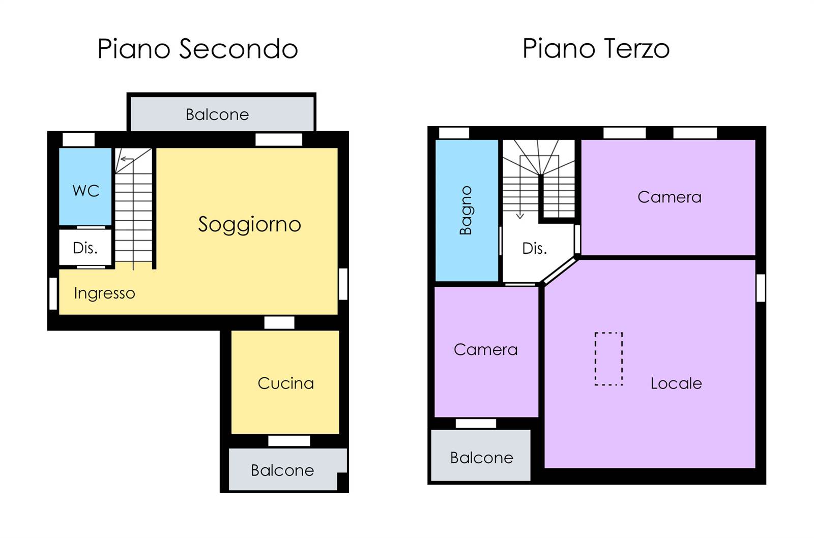 L'appartamento è composto sul piano da soggiorno, cucina abitabile, bagno con lavanderia e due balconi, mentre al piano superiore troviamo due camere, un grande locale mansardato, secondo bagno e balcone.